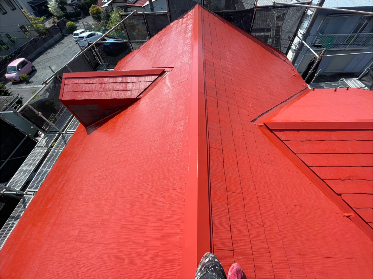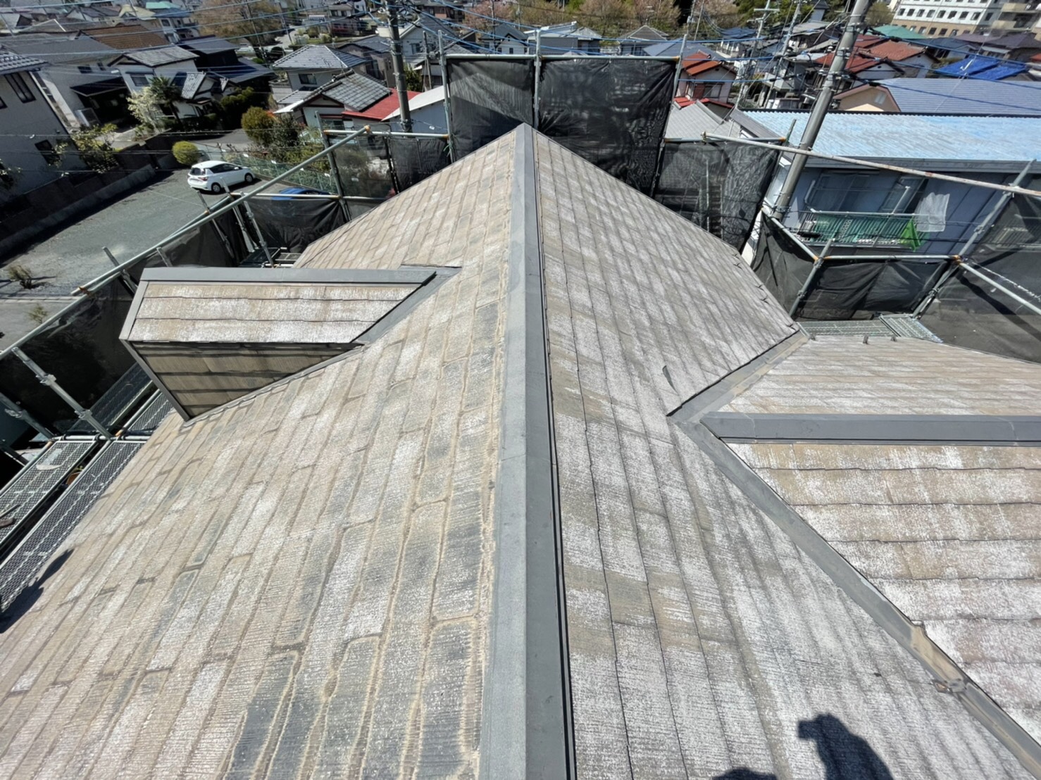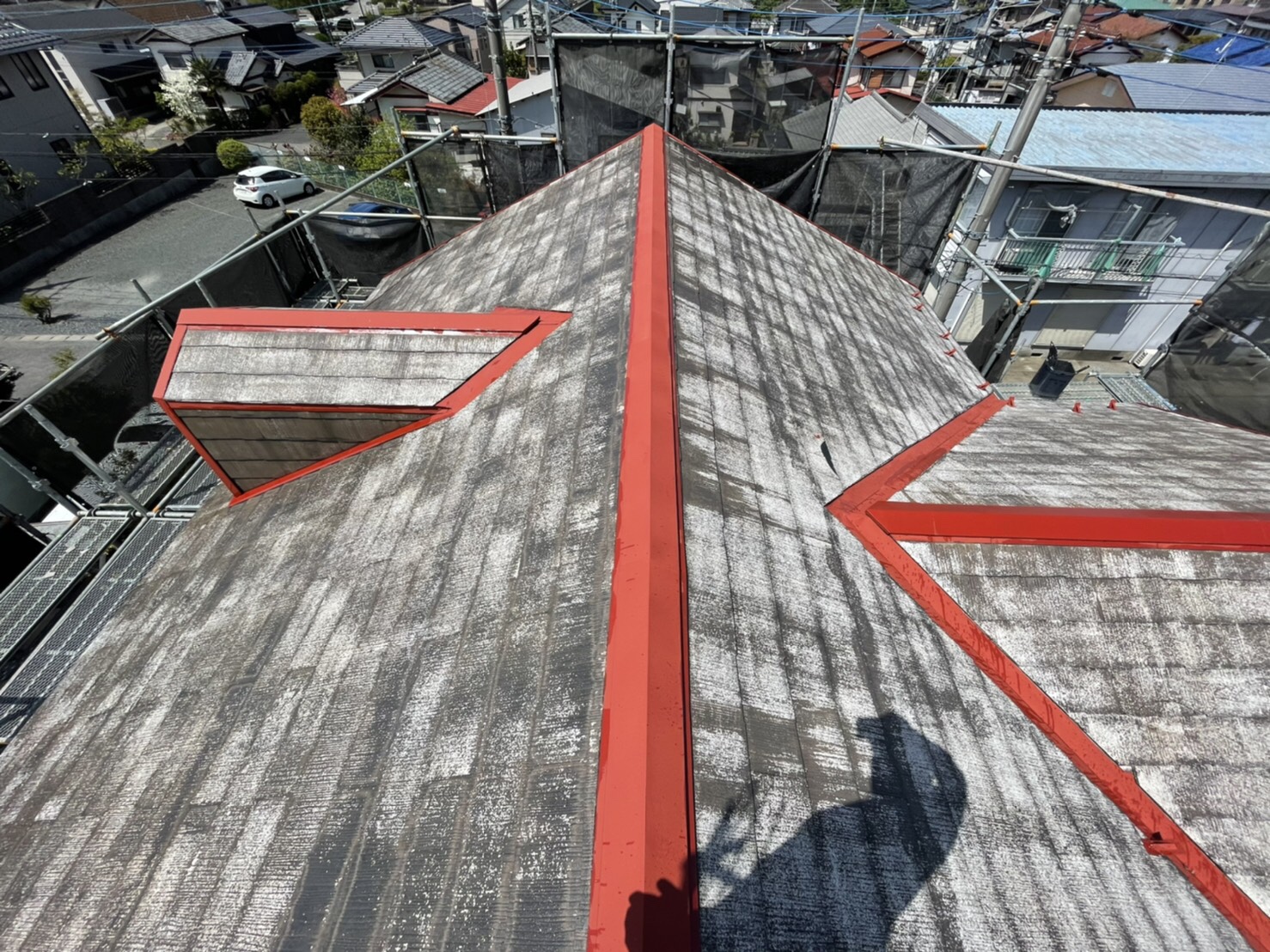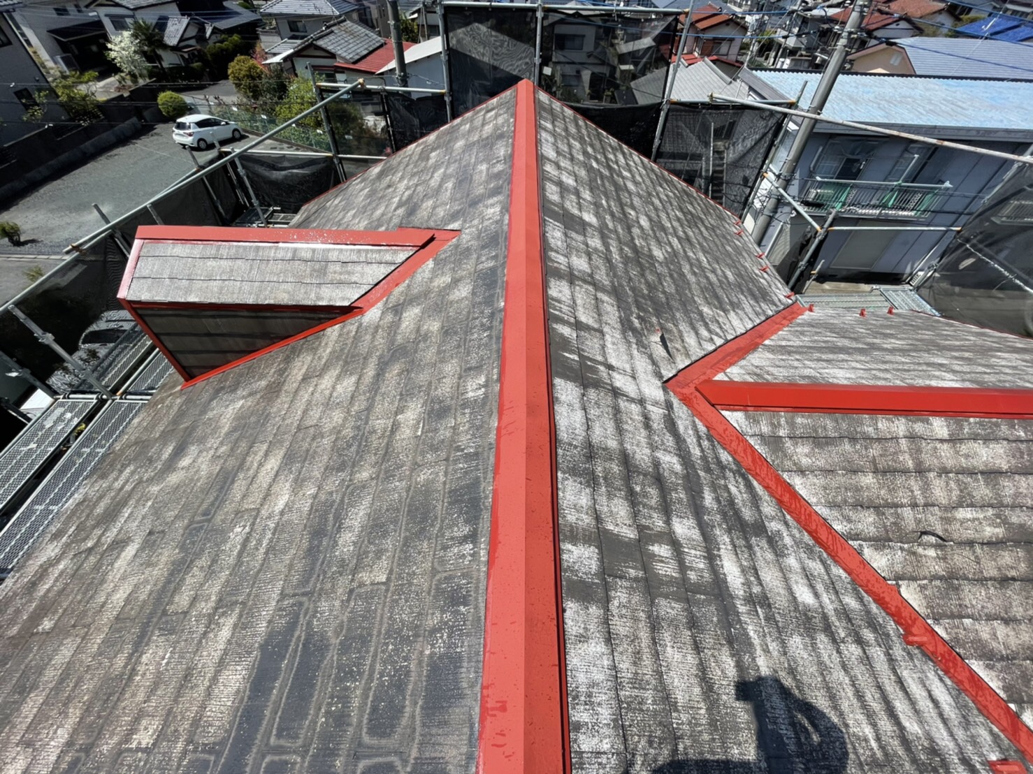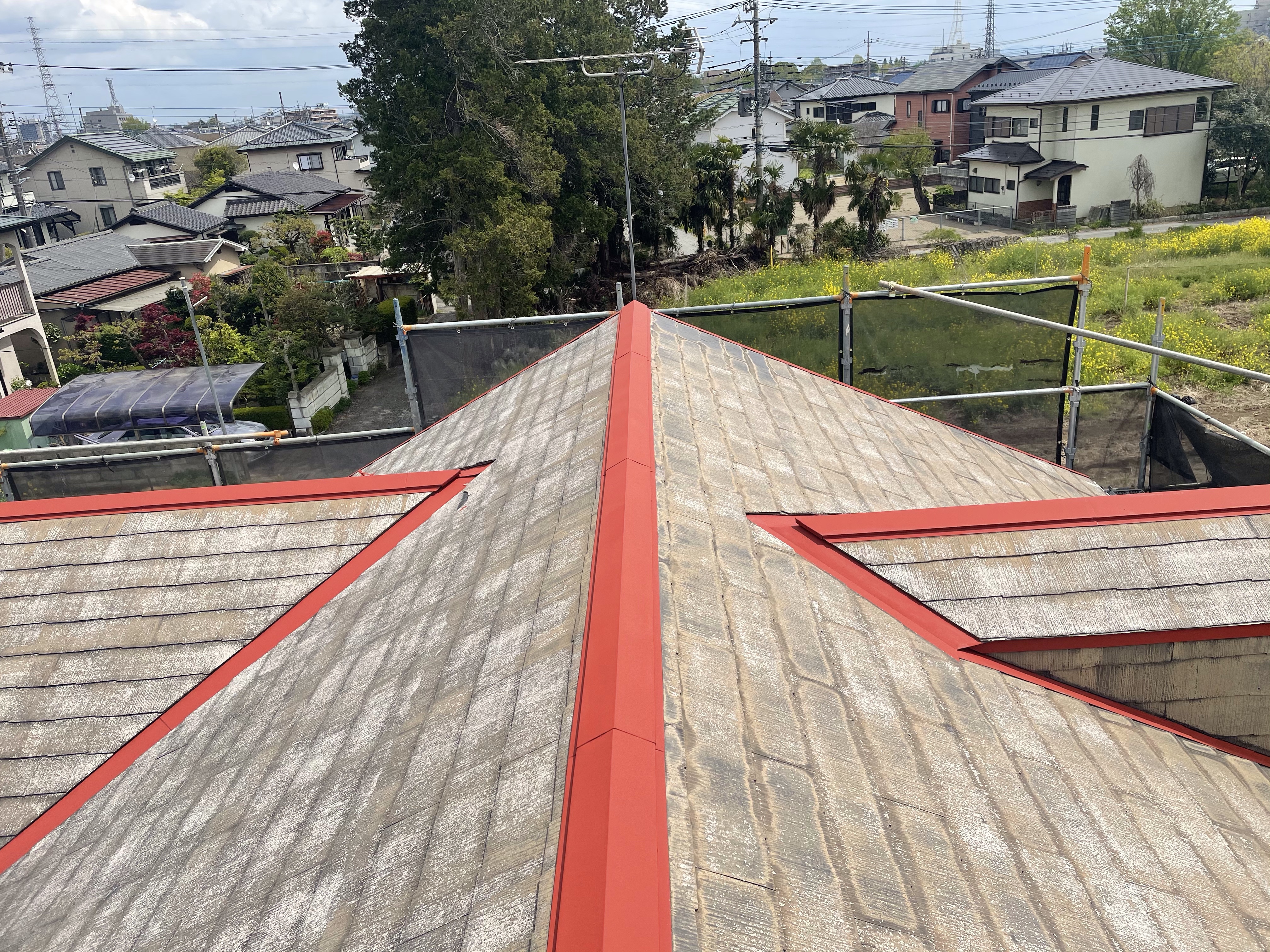 劣化が酷いことから吸い込みも相当有ましたので下塗りを2回行いました。ハローペイントでは屋根塗装においても下塗りは2回行い上塗の密着性を高めます。